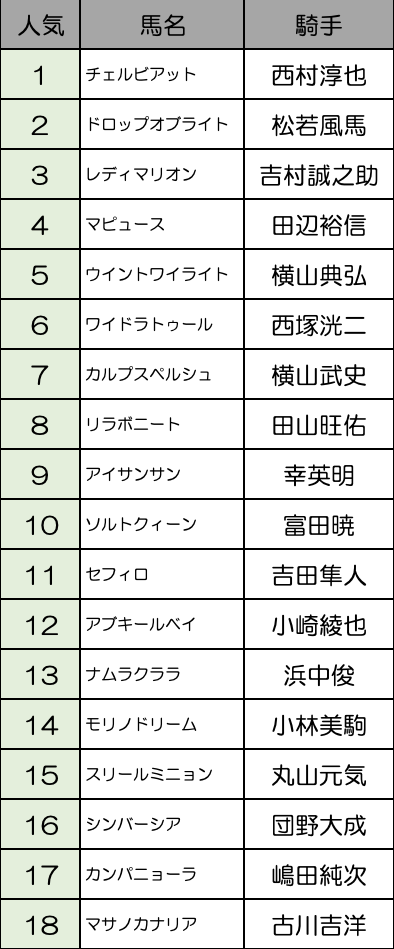 GI好走実績があるチェルビアットと近走の充実ぶりが目立つドロップオブライトが人気の中心か。前走の決着時計の速さでレディマリオンも人気になると見ています。