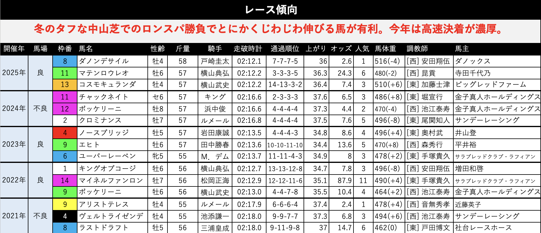 過去5年で大穴で突っ込んできたのはマイネルファンロンのみ。あの年は顕著な外差し馬場でトラックバイアスがハマった感じがありました。