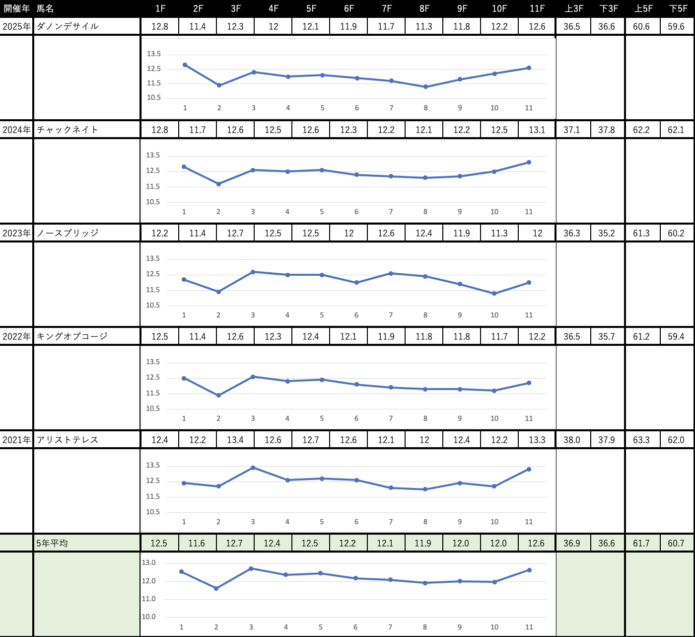 前項で書きました通り、中山芝2200mは外回りコースを使用してスパート地点が速くなるのが特徴。過去5年のレースラップ傾向を見ても、だいたい6ハロン目ぐらいからだらーっと速いラップを継続することが多く、そこからゴールまで6ハロンほど速いラップを耐えて伸び続けなければいけません。それだけ長く脚を使える馬が有利な舞台ということでしょう。