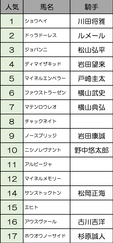 ダービー3着のショウヘイが一応の1番人気か。2番人気はドゥラドーレス、ジョバンニ、ディマイザキッドの3頭でバラける構図になるとみています。
