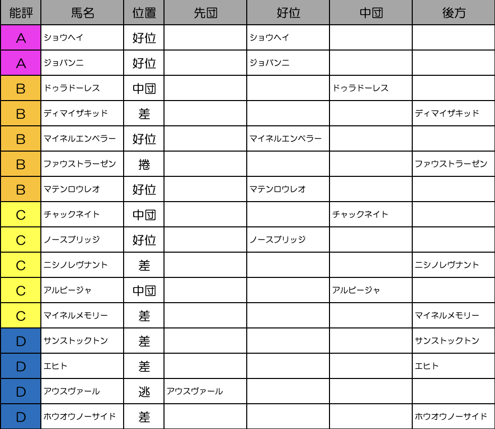 アウスヴァールの逃げは確定的。まぁ前半はスローペースになると思いますが、はたして今回乗り替わりのファウストラーゼンは捲っていくんでしょうか?もともと捲りスタイルだったコスモキュランダを有馬記念で先行させたジョッキーでもありますし、これまでとは違う戦法をしてくるかもしれません。