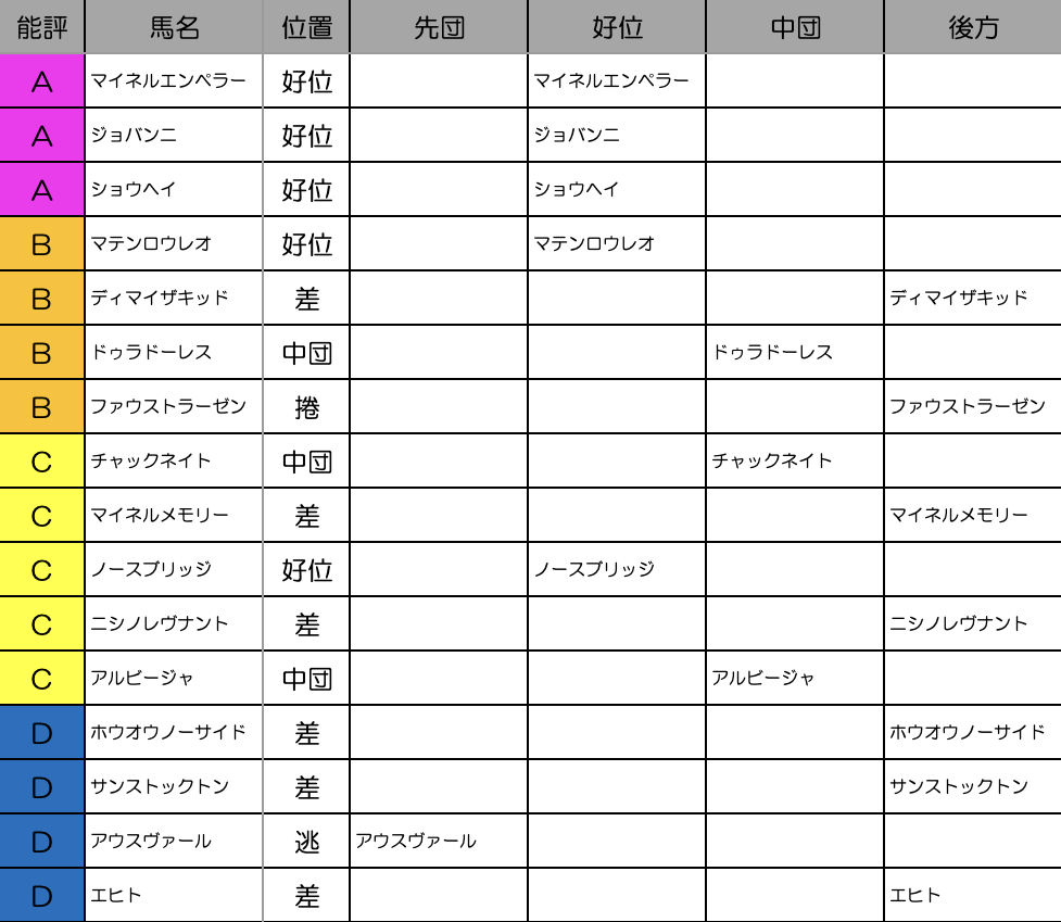 これを見れば縦比較で走破時計やレースラップがどれくらい優秀なのか把握できますし、予想の際にこれを見ればどの馬が強いレースを戦ってきたのかが一目瞭然です。