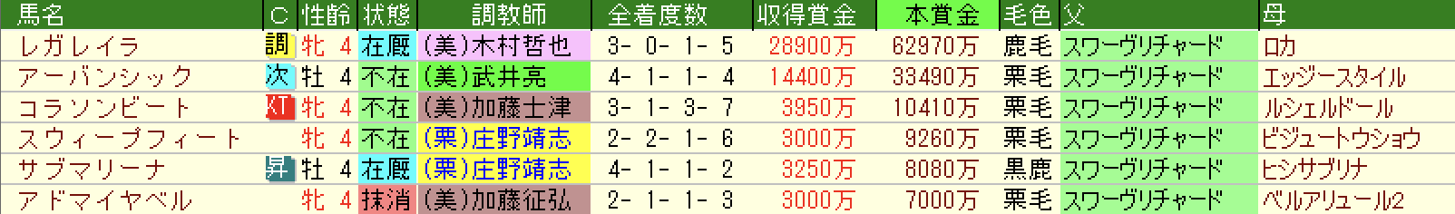 こうして見ても早い時期から活躍していたスワーヴリチャード産駒で古馬になっても活躍している馬は皆無。G1レベルの活躍をしていたアーバンシックやコラソンビートでも燃え尽きた感じがしますし、4歳になってからほぼ走っていないレガレイラも終わっているリスクは考えておきたい。データ的には4歳牝馬で戸崎騎乗で最高なのでそれらを考慮してこれぐらいの評価。