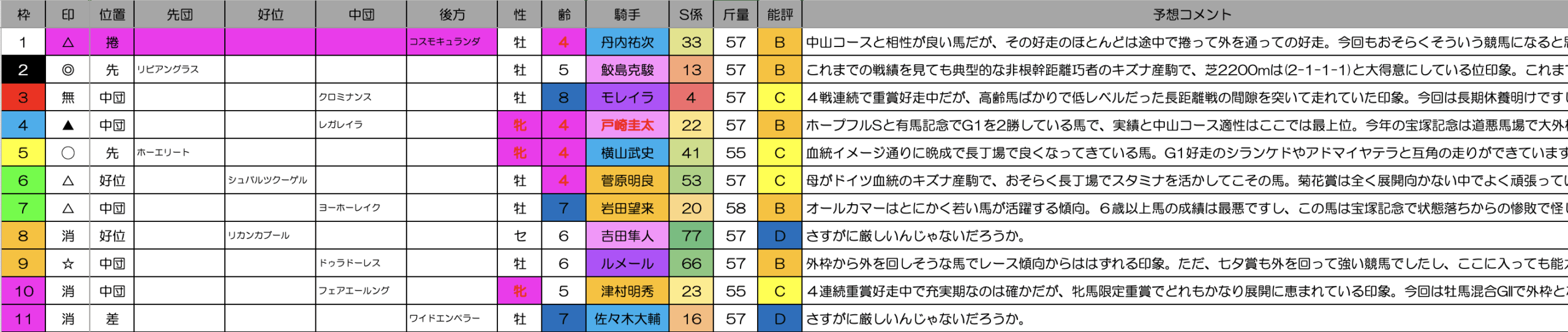 前半スローペースは確定的だと思いますが、さすがに今回はコスモキュランダが途中で捲って行きそう。それで前の馬がどれくらい苦しくなるかがポイントです。