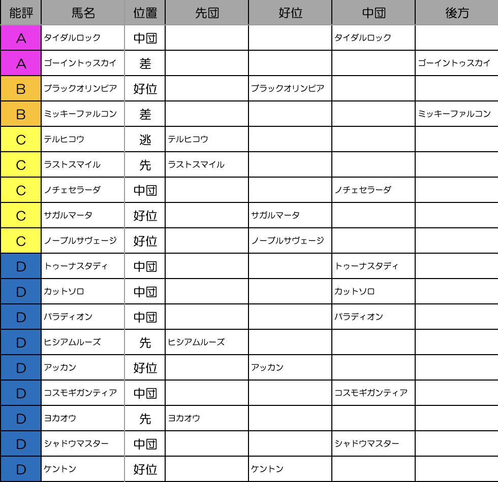 テルヒコウ、ヨカオウあたりが逃げ候補。このレースにしては先行馬がそれなりにいますし、例年通りに差しが決まるレースになるんじゃないだろうか。