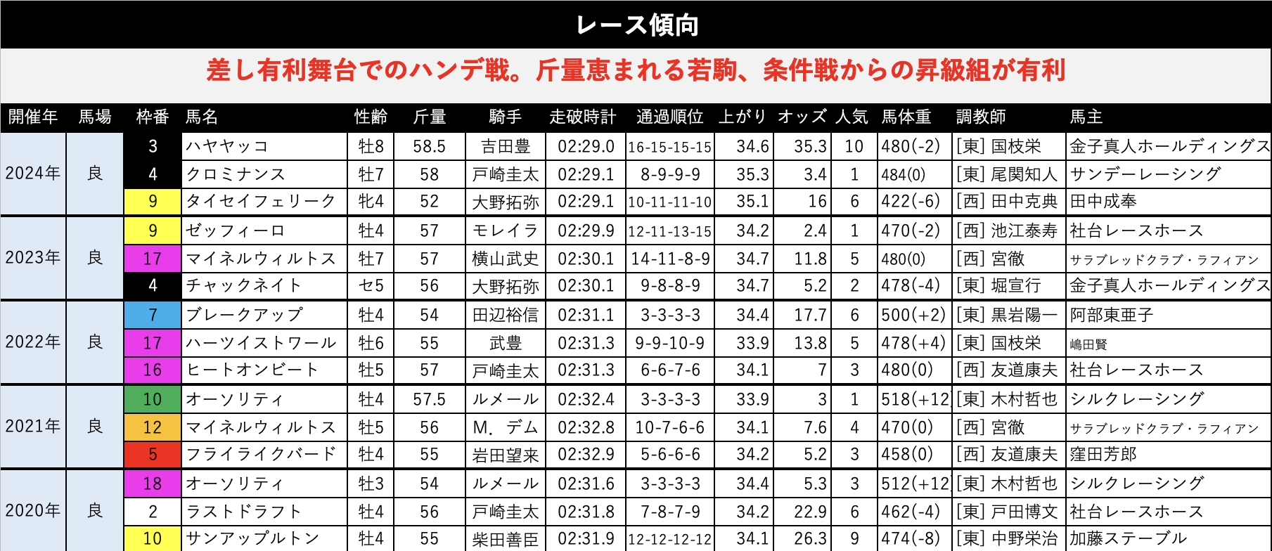 一方で3歳馬や前走3勝クラス組の馬たちは成長途上で勢いそのままにこのレースに臨んできていますし、ある意味でこのレースが目標なので状態もメイチ。その上で実績があまりないためにハンデも軽くなるので、そういったフレッシュな3歳馬や3勝クラス勝ちの馬たちの活躍が目立っています。