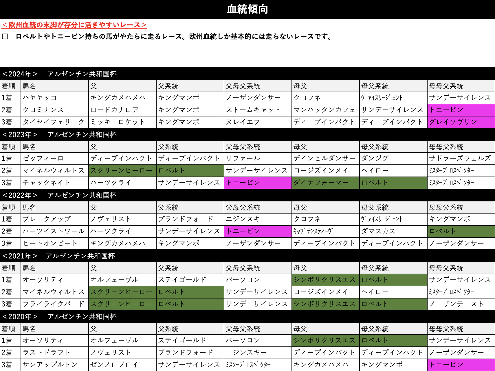 前項のラップ傾向のところでも書きましたが、アルゼンチン共和国杯は速い上がりではなく、34秒フラットぐらいの脚でいいので長く脚を使える馬が走りやすい舞台。スタミナがあってなおかつ末脚の質が優秀、といえば日本やアメリカの競馬よりもヨーロッパの競馬ですし、アルゼンチン共和国杯は父か母父に欧州血統を持っている馬の独壇場となっています。