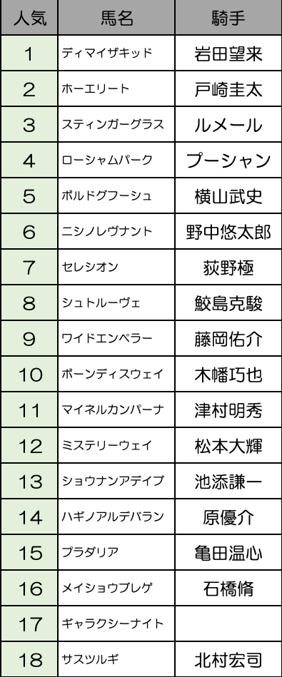 スティンガーグラスはルメール人気、ローシャムパークは実績人気はすると思いますが、どちらも買いにくい要素はあるので、現代競馬の玄人層から少し見放されての3、4番人気ぐらいと見ます。