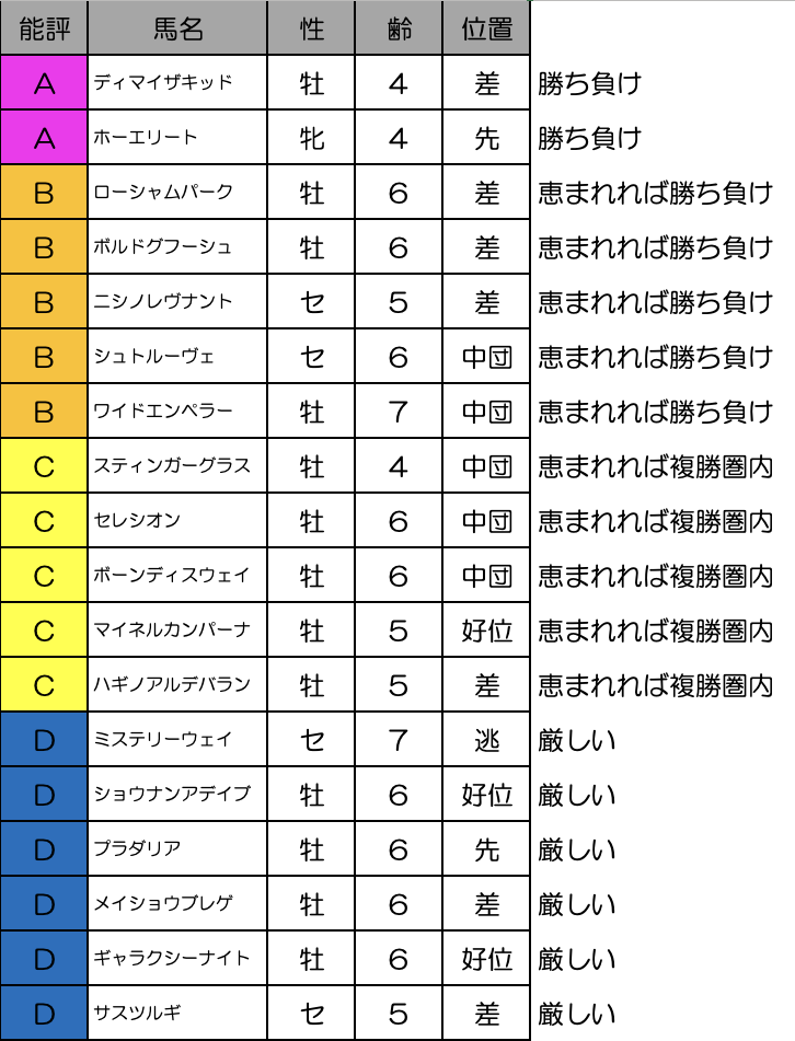 混戦オッズを想定。おそらく1番人気は2戦連続で重賞4着で、誰もが距離のびれば末脚届くと考えていそうなディマイザキッドでしょう。この馬を中穴帯で買えると思っている人は考えを改めた方が良さそうです。