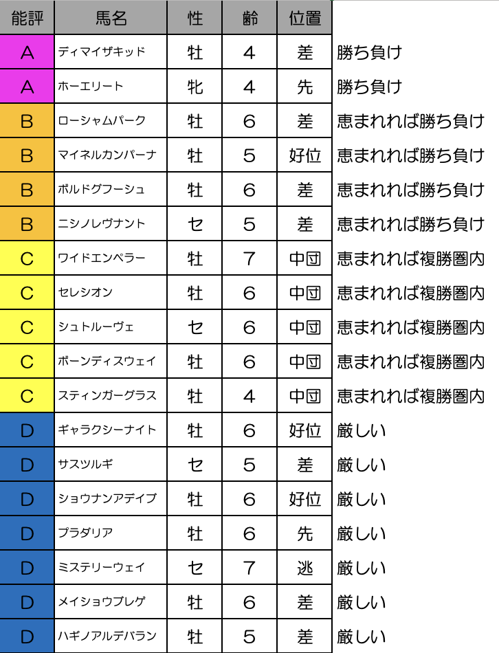 今回は前走の圧巻の末脚+過去に距離経験あるということで一気に人気になりそうですが、距離が伸びて前走と同じ末脚を使えるかはブラックボックス。その割に玄人層に狙われすぎて妙味がないのでこれぐらいの評価で。