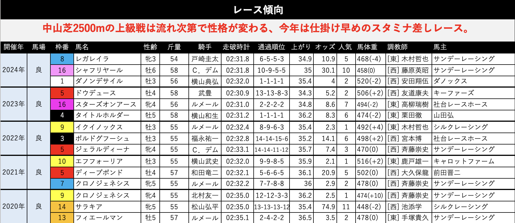 今年も「スタミナ」レースになるのか「立ち回り」レースになるのかを判断するのが重要になりそう。どうも今年はミステリーウェイ、メイショウタバルといった徹底先行タイプがいる上にジャパンカップが不発に終わったサンライズアースが早めに仕掛けていきそう。今年は前がやり合ってスタミナ差しレースになる可能性が高いと見ています。