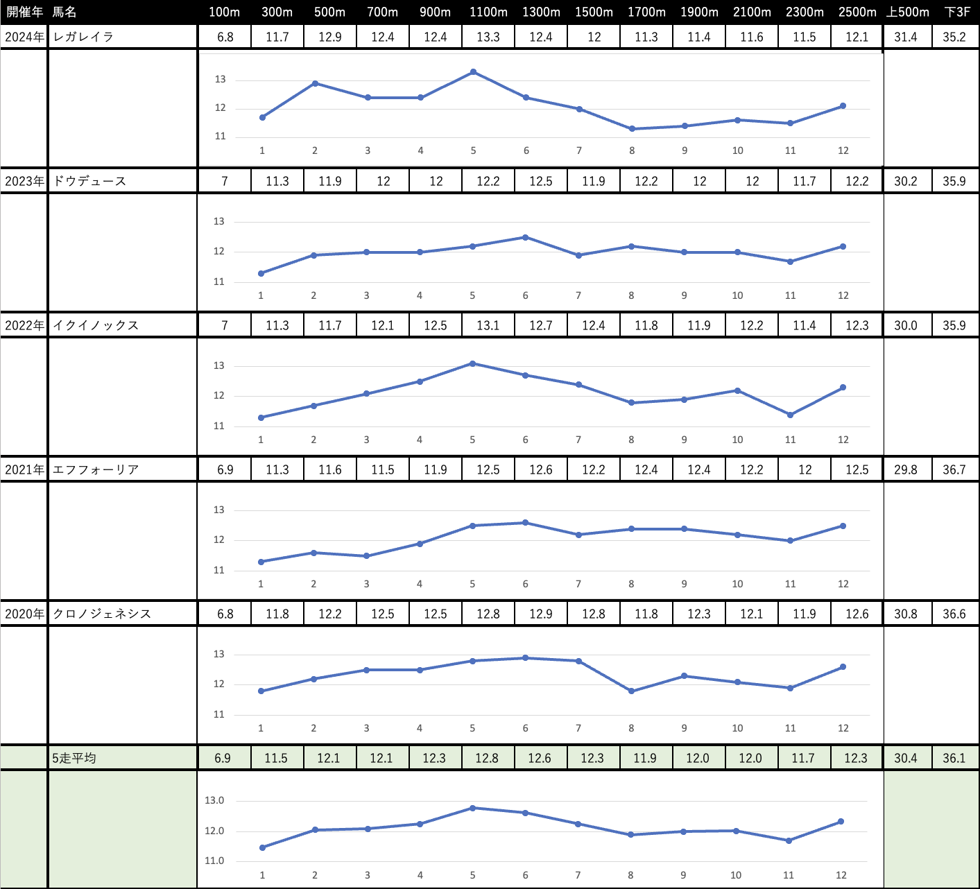 前述の通りで、その年によって展開がガラリと変わる傾向のレース。その年のメンバーによってどういうレースラップになるかは変わります。まぁどんなラップになってもレース上がりは35秒台後半ぐらいはかかります。