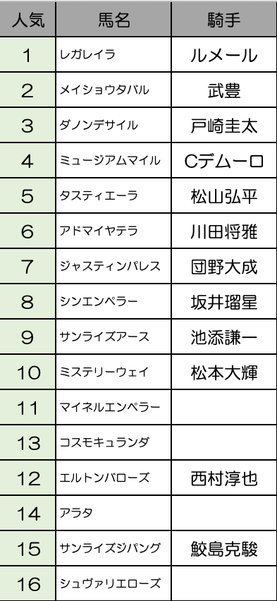 本当はビザンチンドリームを本命にしたかったのですが回避。そうなると今年の有馬記念はスタミナがありそうで右回りコースが得意な差し馬がほとんどいません。ルメール騎手が大得意な舞台でもありますし、ここはレガレイラで仕方がないのでは??