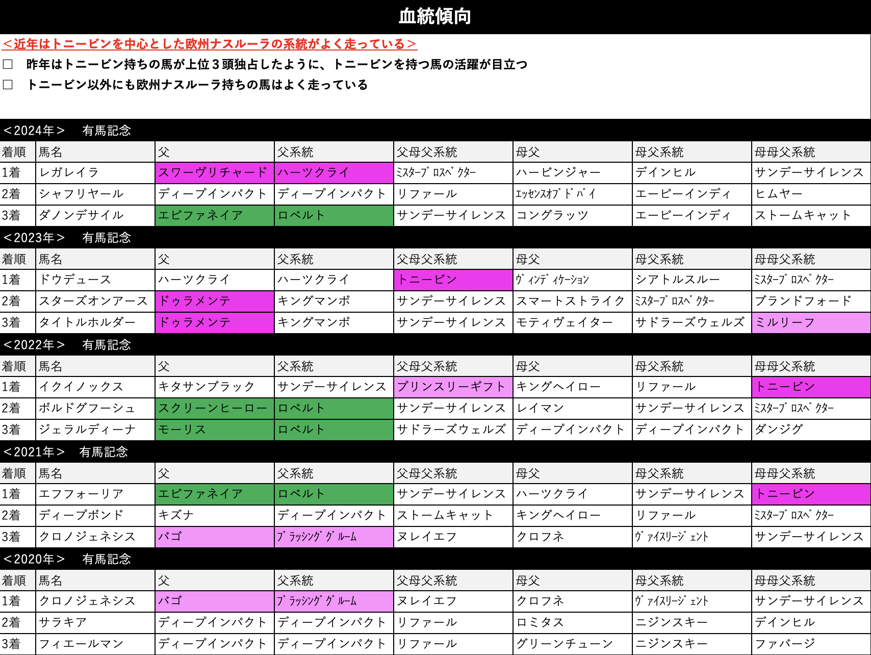 近年はトニービンを筆頭とする欧州ナスルーラ系の血を持つ馬やロベルトの血を持っている馬の活躍が目立っています。それだけスタミナが問われるレースということでしょう。
