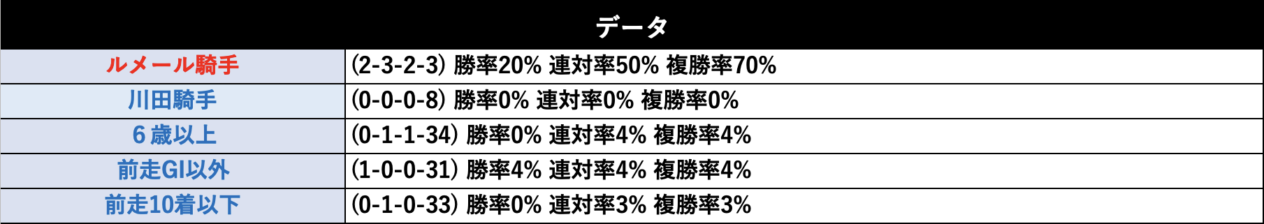 一方で川田騎手の成績は最悪。溜めを効かさずに早めに仕掛ける川田騎手のスタイルとは真逆のレースということでしょう。