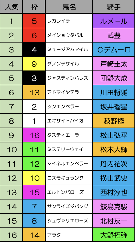 考察文中にも書いた通りで、今年の出走メンバーの中でインでじっとして脚を溜める競馬をしそうな馬、ジョッキーがレガレイラとミュージアムマイル、ジャスティンパレスの3頭しかいません。