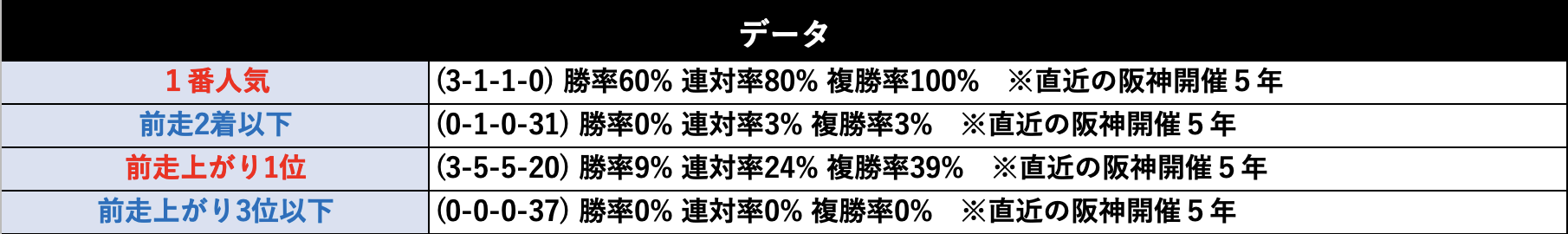 そんなクラシック路線に繋がる素質馬が順当に走るレースということで、1番人気の馬がパーフェクト好走中。前走上がり1位の馬の成績も良いですし、基本的には走りそうな馬が順当に走るレースということです。