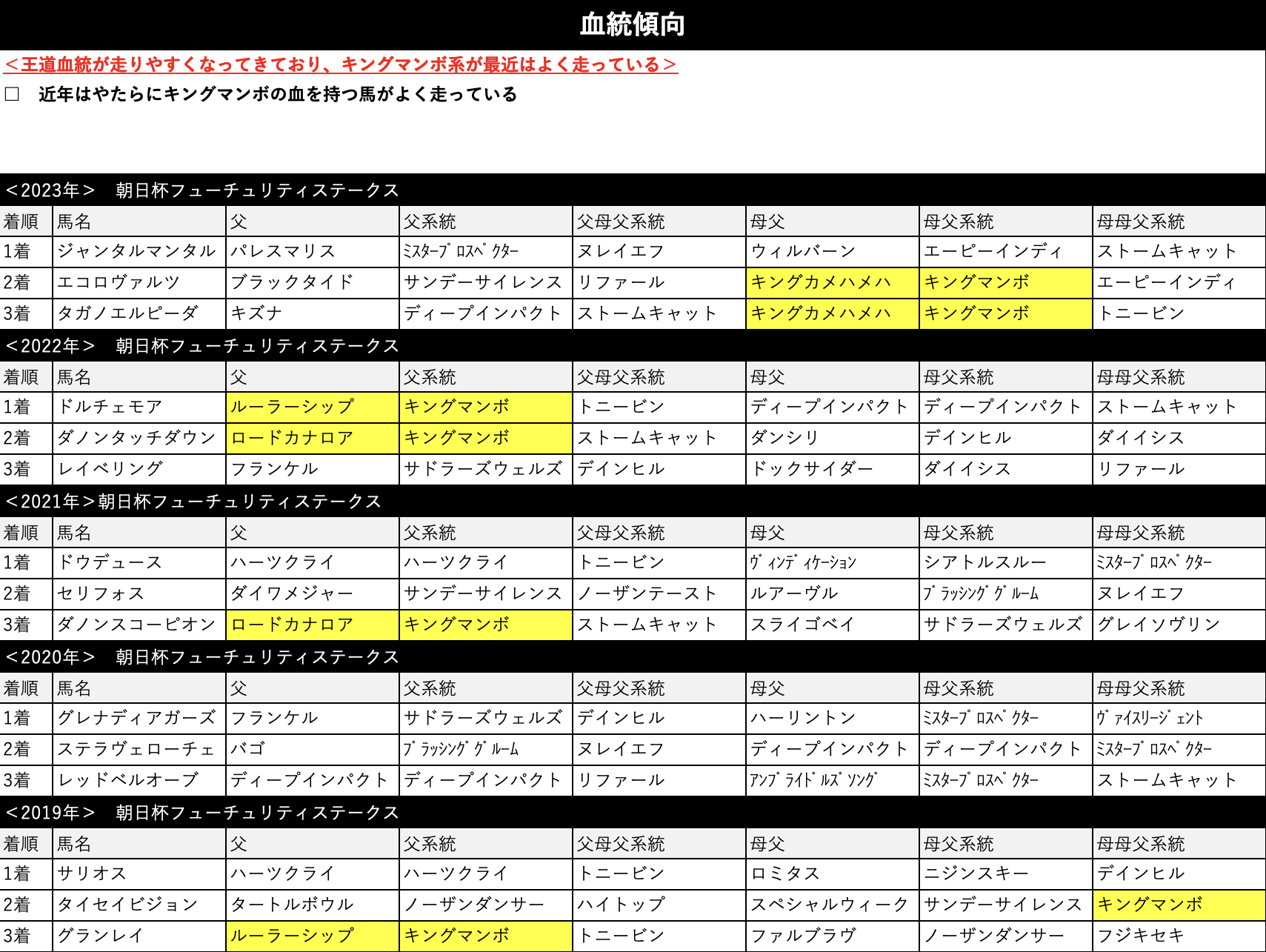 クラシックに直結するようになってきているレースで、血統的にも王道クラシック血統が構想しやすくなってきている。近年は特にキングマンボ系の好走が目立ちます。