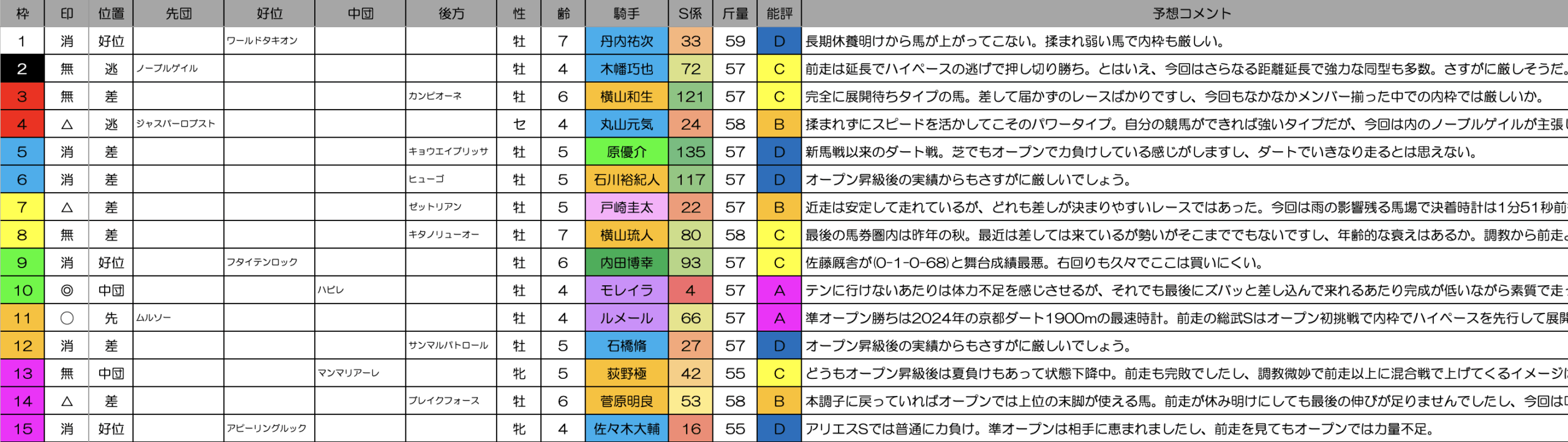 準オープン勝ちは2024年の京都ダート1900mの最速時計。前走の総武Sはオープン初挑戦で内枠でハイペースを先行して展開全く向かない中で4着。普通に負けて強しの内容だったが、謎の転厩初戦で好走時のCW調教も行わずで状態がどうだったか。