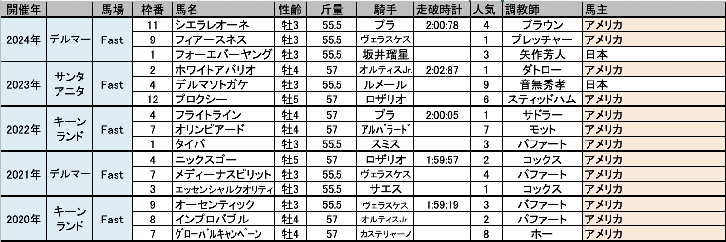 アメリカの競馬場で開催されるダートレースということでアメリカ調教馬の成績が優秀なのは当然。過去2年は日本のデルマソトガケ、フォーエバーヤングが大健闘を見せましたが、基本的にはアメリカ調教馬が圧倒的に強いレースです。