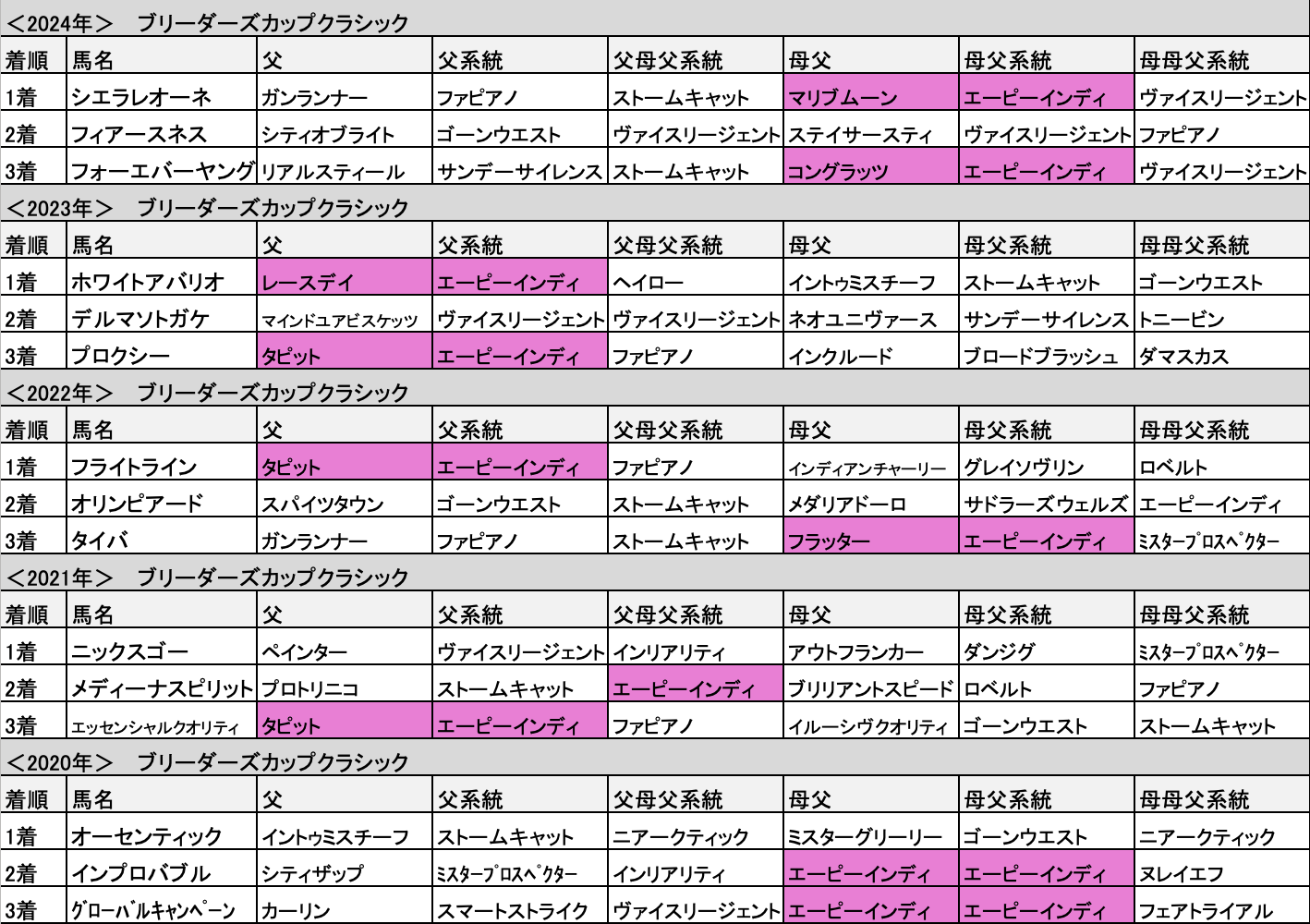 こうして見ても近年は父か母父エーピーインディ系(特にタピット系)の活躍がかなり目立っている傾向。タピットの系統はベルモントステークスでも活躍が目立つ通りで消耗戦に非常に強いですし、やはりBCクラシックはスタミナに秀でた血統が活躍しやすいんでしょうか。