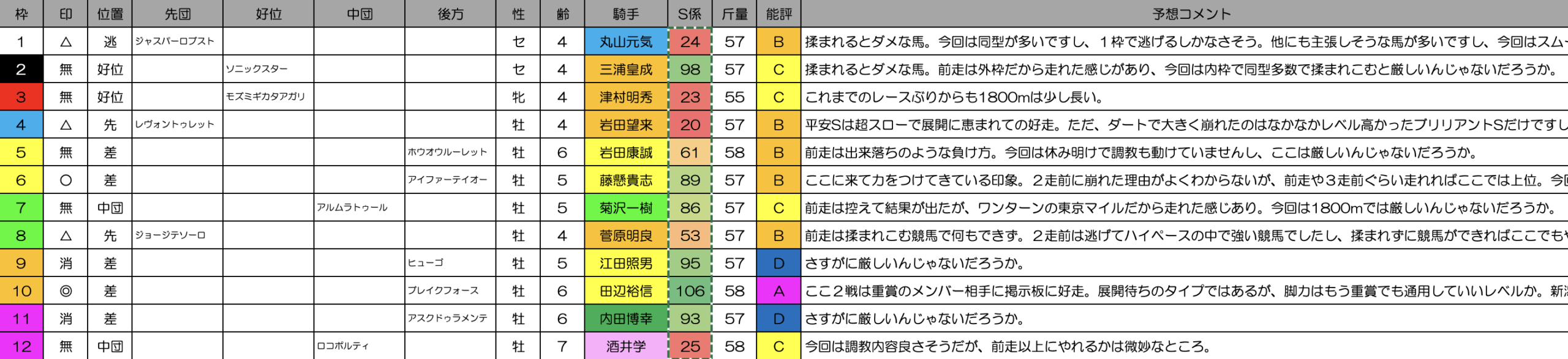 揉まれたくない逃げ先行馬が割と揃った感じのメンバー構成。最内枠を引いたジャスパーロブストが主張せざるを得ませんし、中枠のジョージテソーロも主張していきそう。レヴォントゥレットやソニックスターの出方次第では速い流れになりそうです。