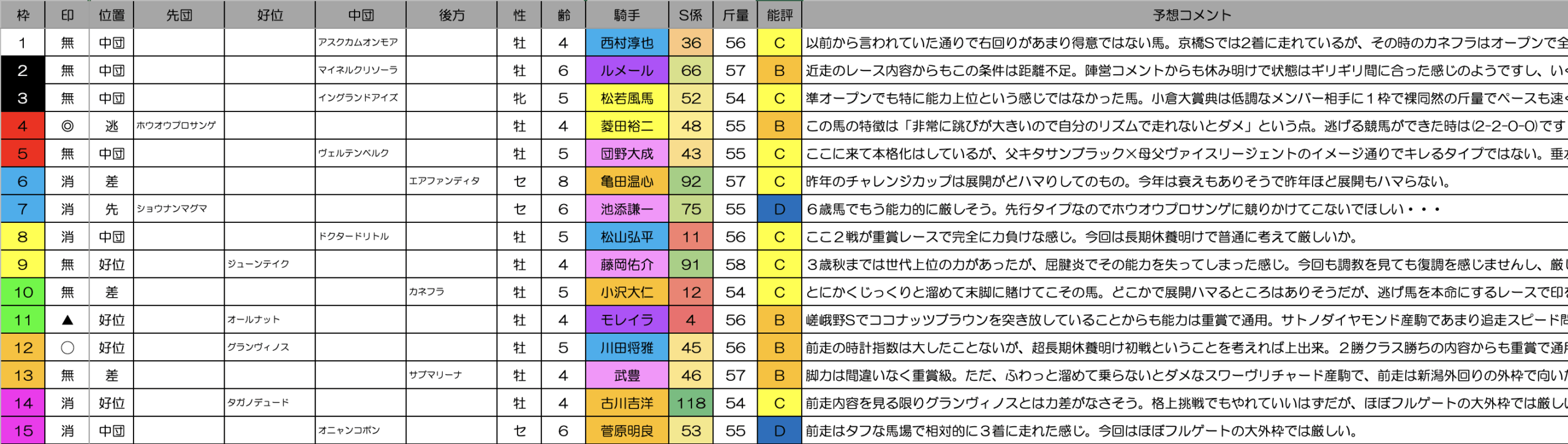 前に行きそうな馬がそこまでいないメンバー構成。おそらくこのメンバーならホウオウプロサンゲかショウナンマグマあたりが逃げる展開か。ホウオウプロサンゲのゲートが決まればホウオウの単騎逃げになると予想します。