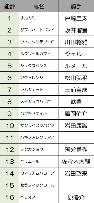 混戦オッズになりそうで、上位はナルカミ、ダブルハートボンド、ウィルソンテソーロ、ルクソールカフェ、シックスペンスあたりが人気になりそうです。