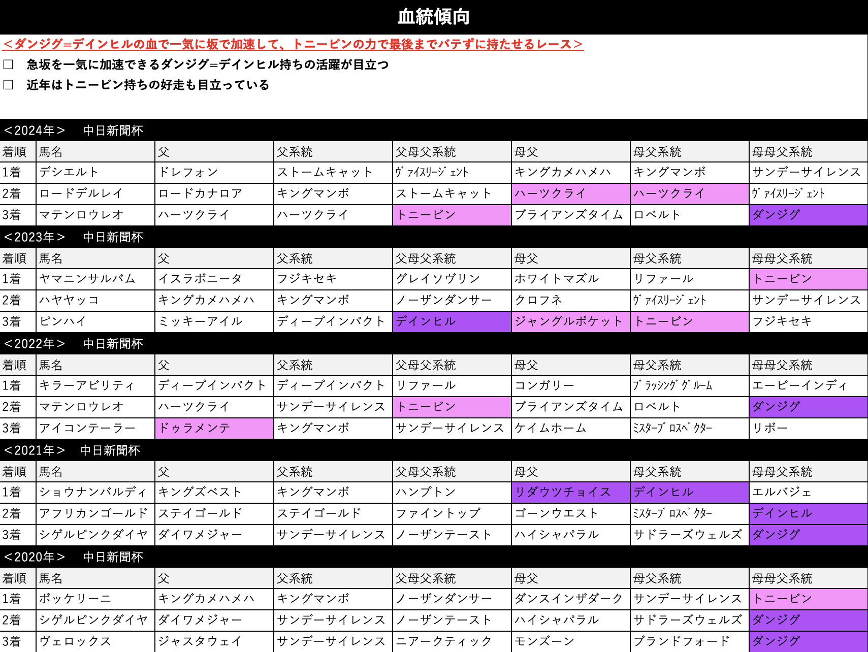 直線入り口に急坂がある中京コースで急加速できる血統が有利なのか、ダンジグ=デインヒル持ちの活躍が目立つ。近年はトニービン持ちの好走も目立っています。