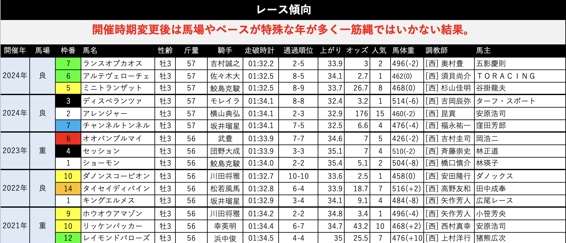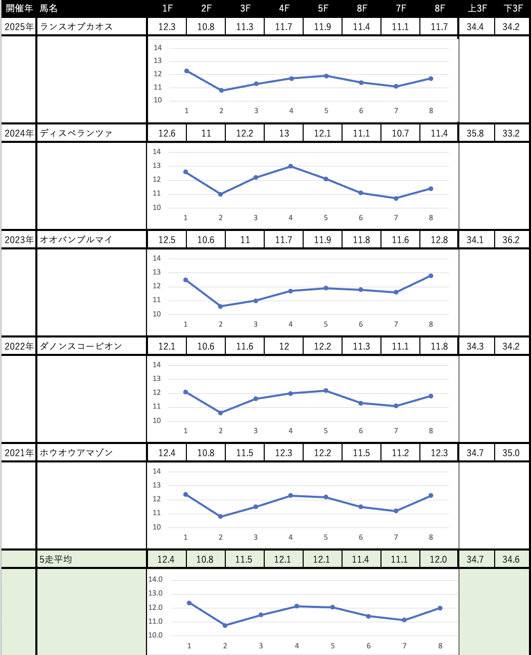 2024年が極端な超スローペースでしたが、それ以外は前半3F=34秒台中盤ぐらいで平均的な流れになりそう。2021年と2023年は雨馬場なので上がりはここまでは普通の馬場ならかからないと思います。