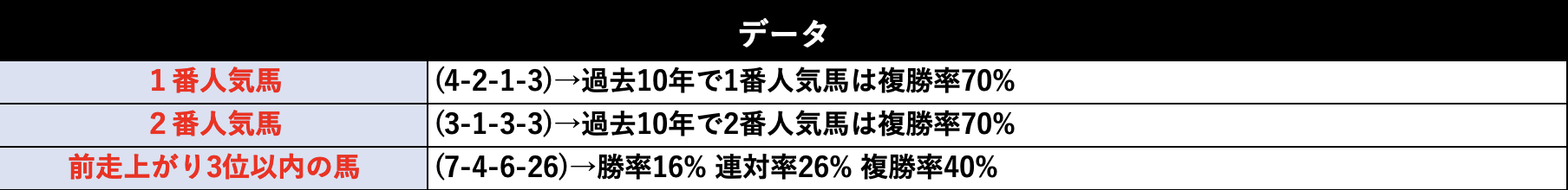 特殊条件のハンデ戦ではありますが、1番人気と2番人気の馬の信頼度はまずまず。瞬発力が問われるレースなので前走上がり順位が3位以内の馬の成績も良くなっています。