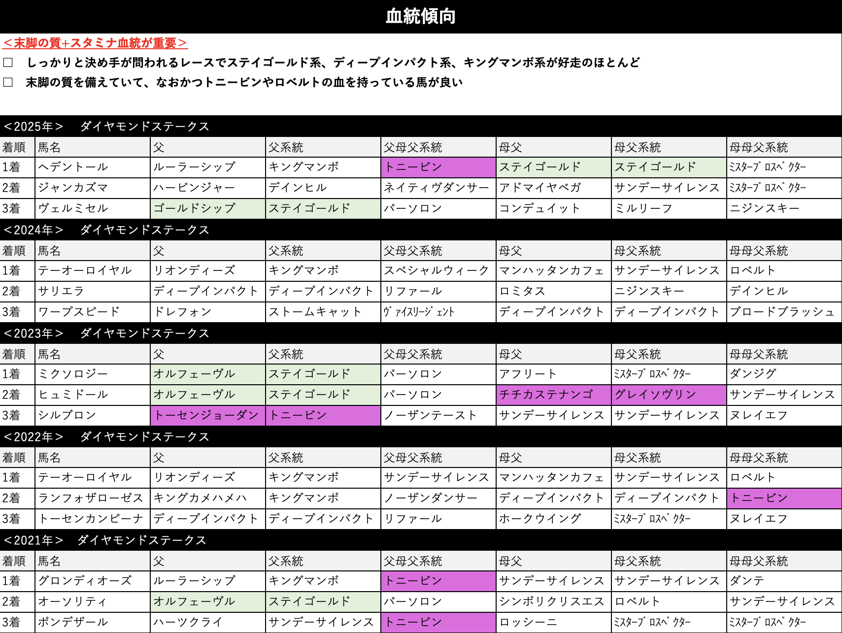 末脚の質を備えていて、なおかつトニービンやロベルトの血を持っている馬が良い傾向です。