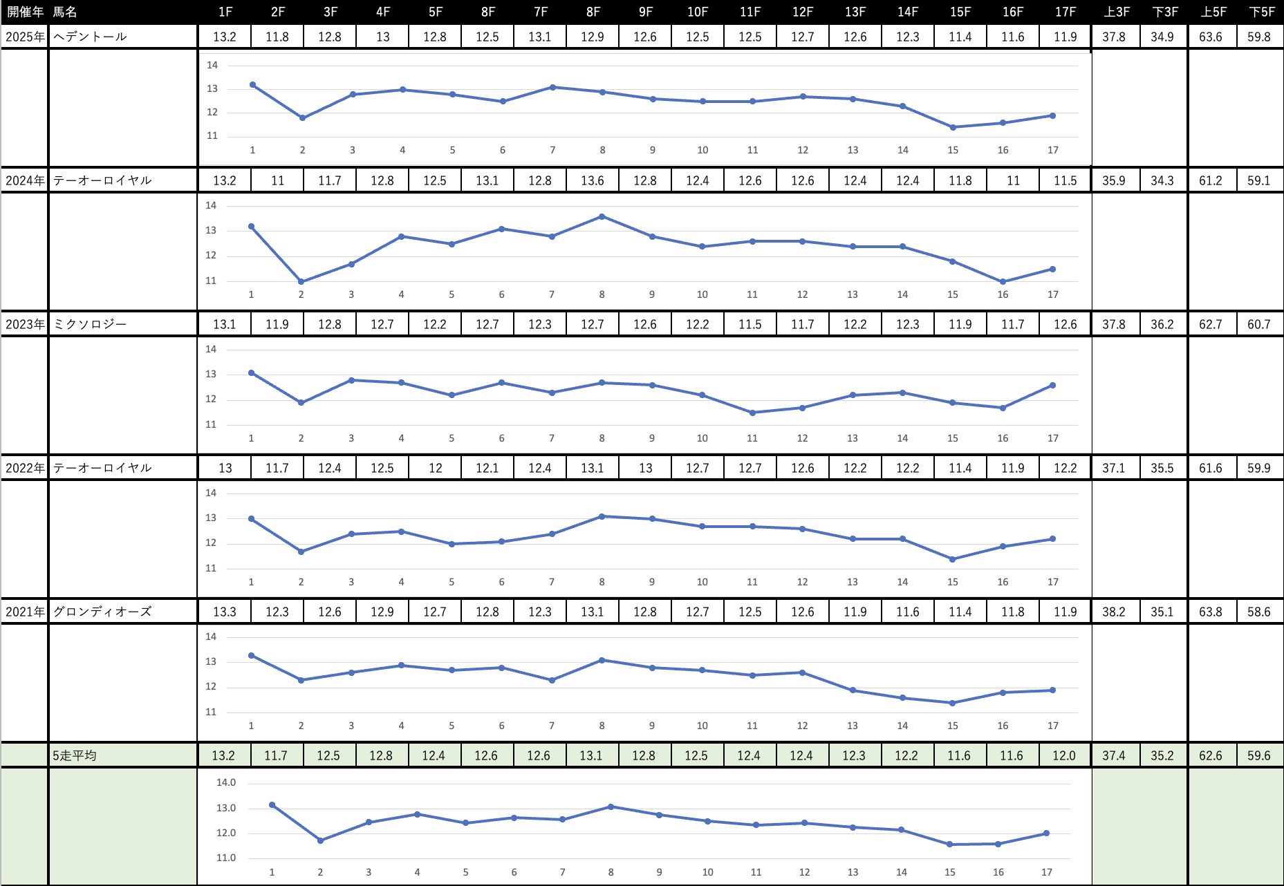 3400mも走るレースなので前半に速いペースになることはほぼありません。過去5年平均も前半1000m=62.4で、一方でかなり早い地点からスパートが始まって後半1000m時計は60.2と速くなっています。