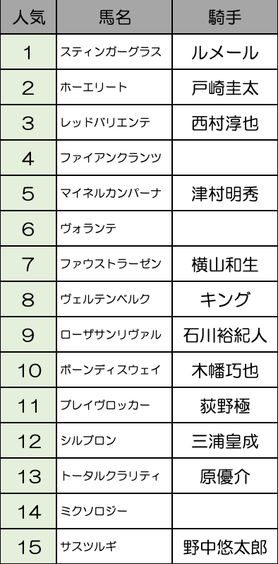 ルメール騎乗でスティンガーグラスが1番人気になるか。ホーエリート、レッドバリエンテ、ファイアンクランツ、マイネルカンパーナあたりがそれに続きそうです。
