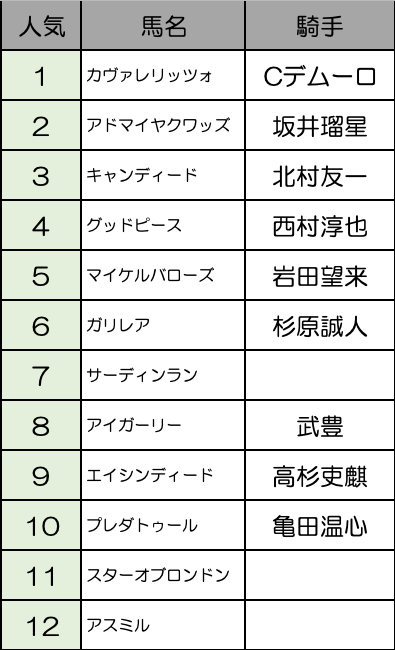 初戦の内容が圧巻だったカヴェレリッツォ、アドマイヤクワッズ、あとは前走でレコード勝ちで重賞を制覇したキャンディードあたりが人気の中心と見ます。