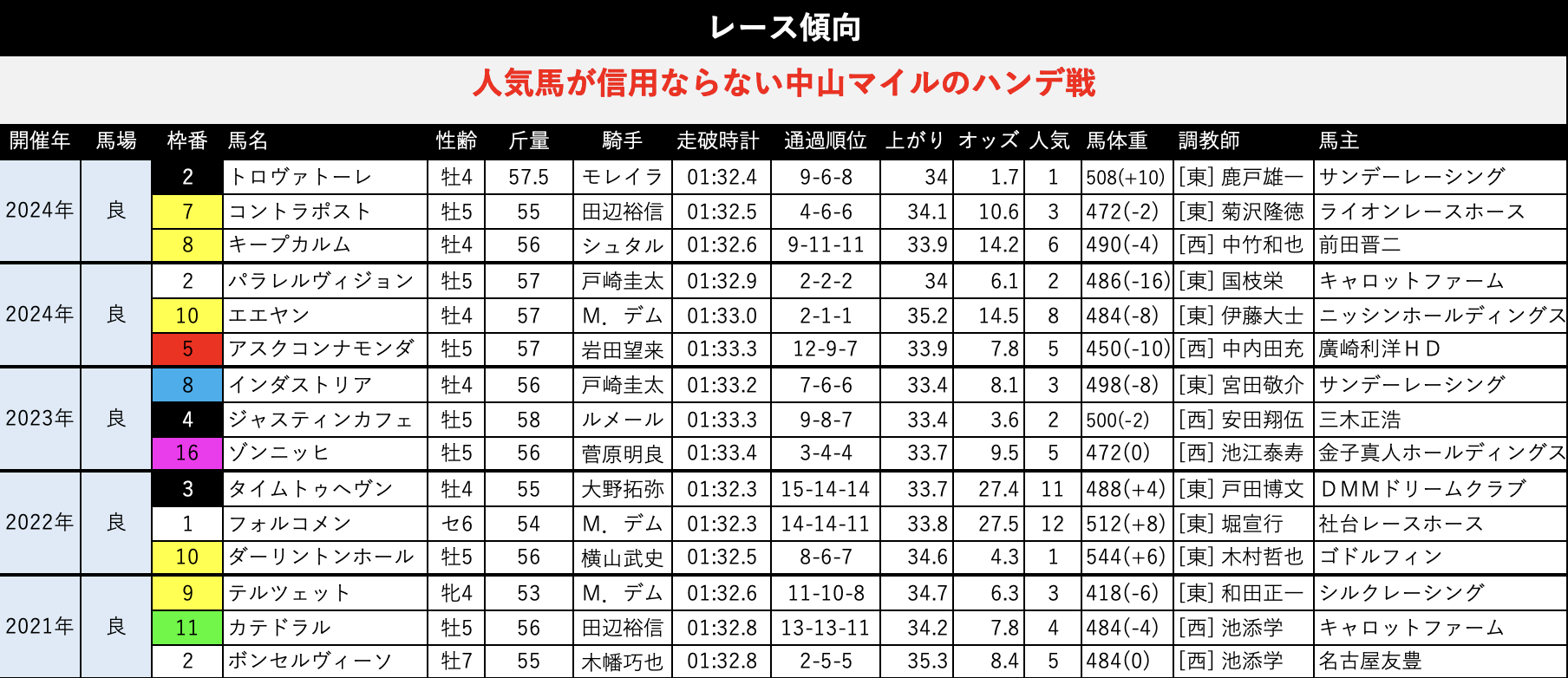 中山芝1600mで開催されるハンデ戦。トリッキーな中山芝1600mで行われるレースということもあり、人気馬が全く信頼できないのがこのレースの特徴。過去10年で見ても1番人気は2勝しかしていませんし、とにかく人気馬が信頼できずで波乱傾向というのは覚えておきたいところです。