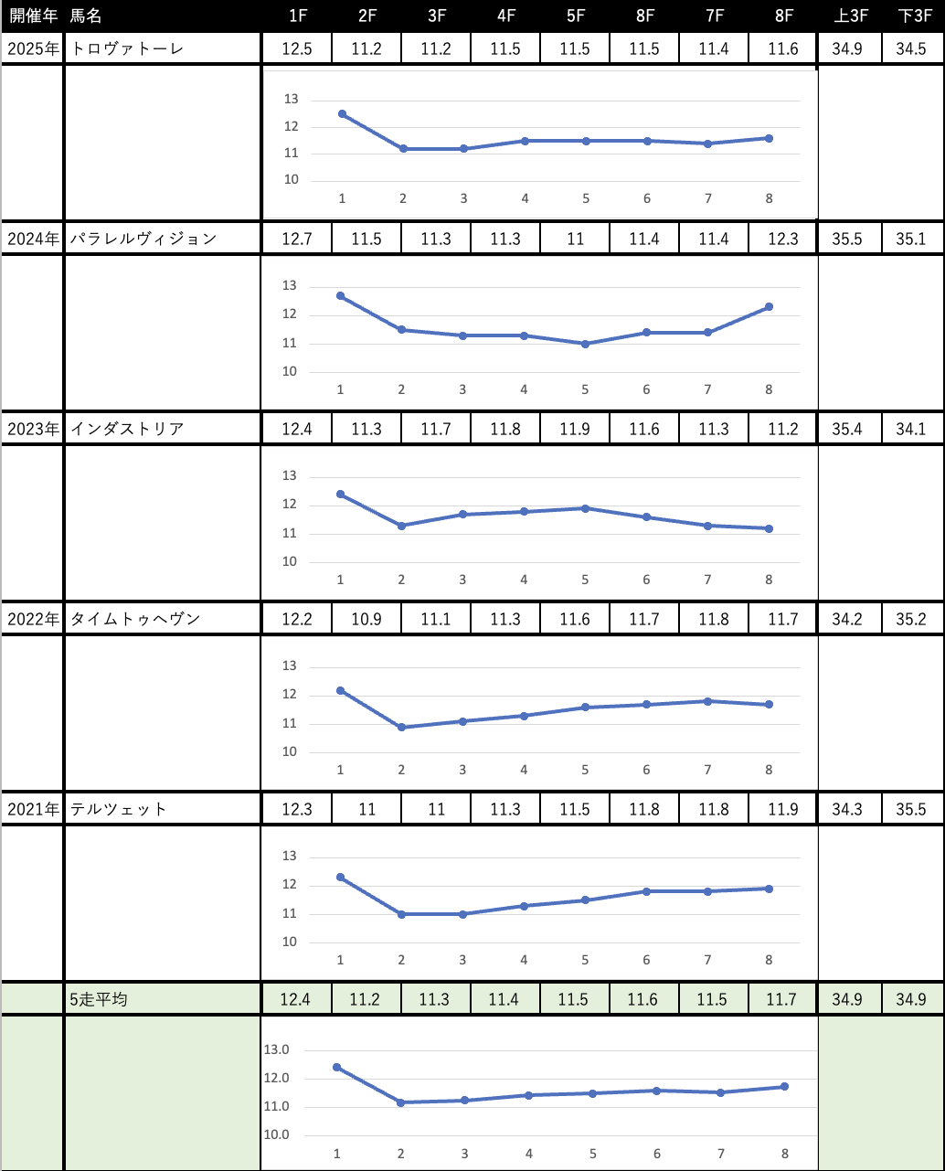 2023年と2024年はスローペースになったが、その2年を含めても過去5年の前半3ハロン平均は34.9。それなりに速いペースになりやすいのが特徴で、先行馬が厳しくなって最後は差しが決まる年が多くなっています。