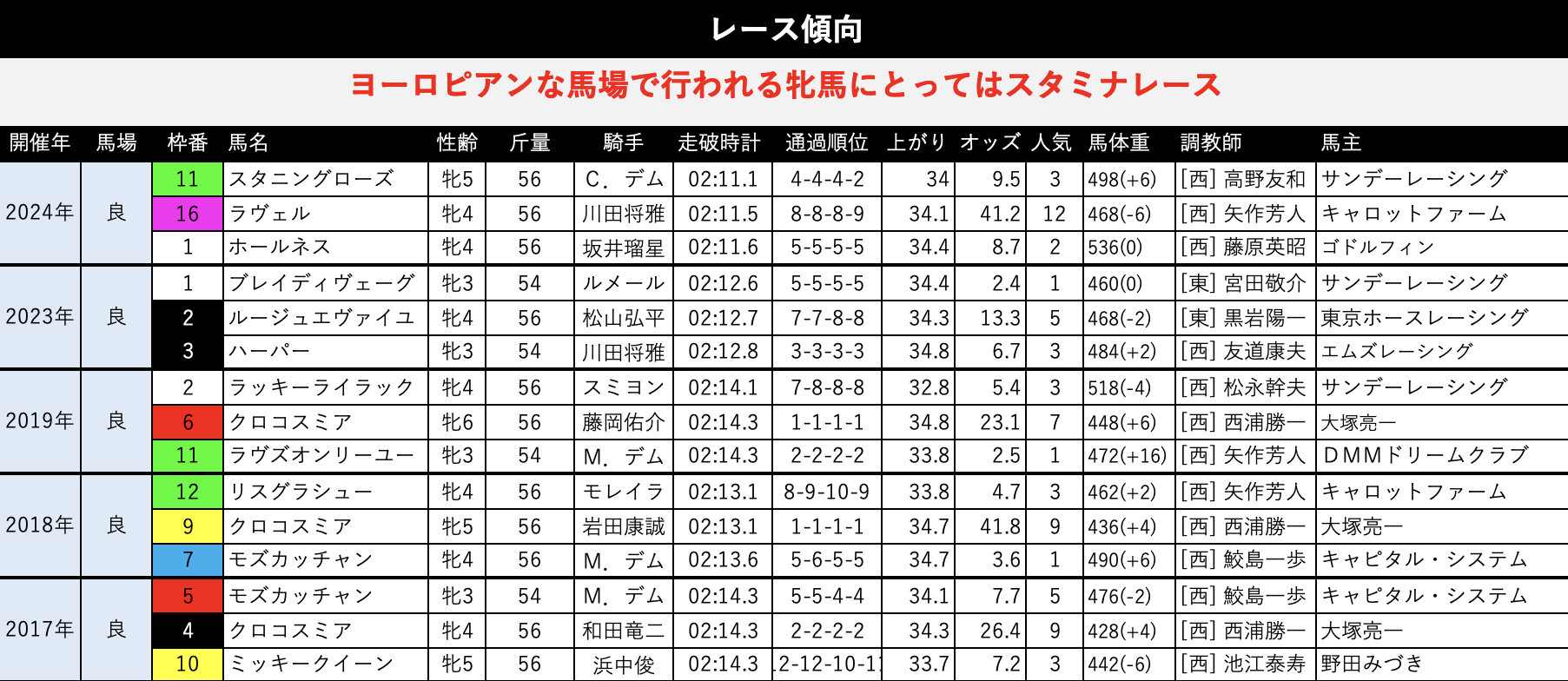 京都開催の過去5年を見ても前半はかなりのスローペースで進んで、4コーナー地点の下り坂でじわっと加速してラスト3ハロンの瞬発戦。2200mを走れるスタミナが前提にあった上でスパッと決め手を活かせる馬が有利な感じです。