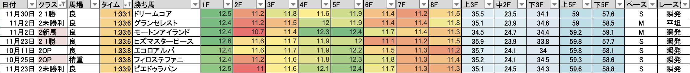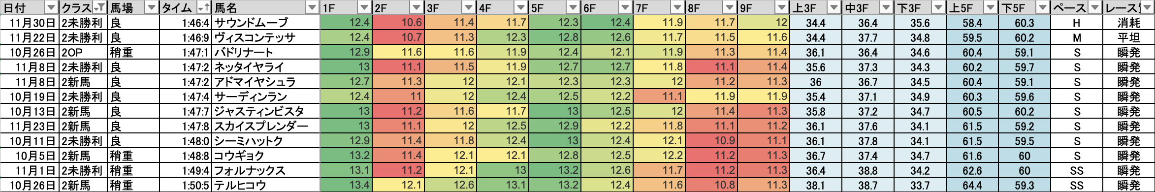 これを見れば縦比較で走破時計やレースラップがどれくらい優秀なのか把握できますし、予想の際にこれを見ればどの馬が強いレースを戦ってきたのかが一目瞭然です。