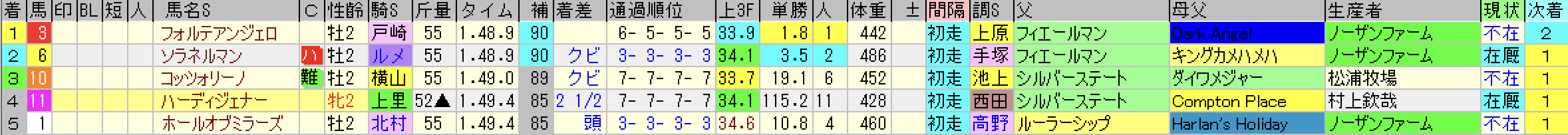 初戦はなかなかの勝ちっぷりではあったが、超高速馬場のコンディションで1分35秒8の時計は遅い。これだけ遅い時計ならラスト1ハロン=10.8は重賞級の馬でなくても叩き出すことはできるんじゃないだろうか。実際に初戦で倒した馬たちは大して活躍できていない。
