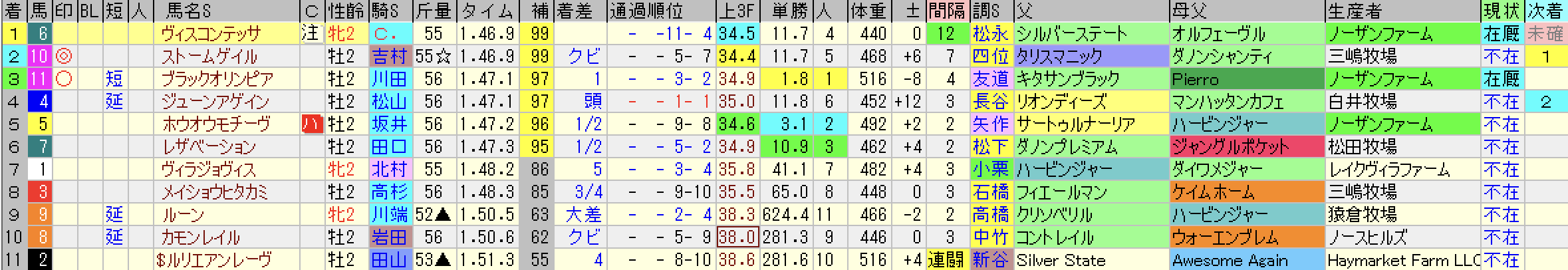 馬場レベルは異なるとはいえ萩Sのバドリナートよりも速い時計ですから、やはりそれなりのレベルにあった未勝利戦と考えていいんじゃないだろうか。実際に2着馬のストームゲイルが次走でハイペースの逃げでかなり強い競馬で勝ち上がっている。