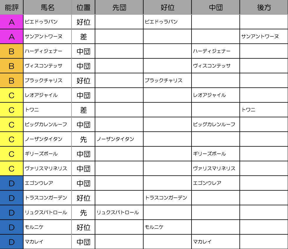 先行タイプの馬が少ないメンバー構成。普通に考えればスローペースになりそうなのですが、基本的にそれなりにペースが流れるレースでもあるので展開幅は広く持ちたいところ。