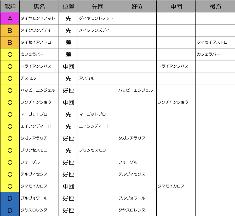 これを見れば縦比較で走破時計やレースラップがどれくらい優秀なのか把握できますし、予想の際にこれを見ればどの馬が強いレースを戦ってきたのかが一目瞭然です。