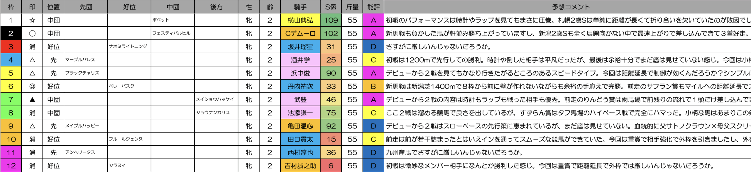 キャリアの浅い2歳馬同士のレースなので、あんまり展開想定をしても仕方がないと思います。平均ミドルペースぐらいが一番想定されるところか。