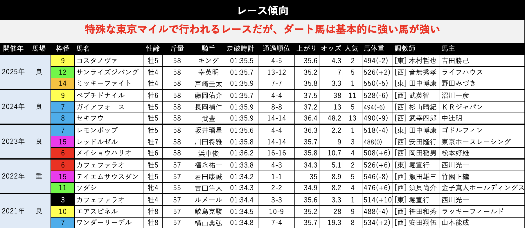 東京ダート1600mで開催される1年で最初のG1レース。以前は上半期のダート馬の頂点を決めるようなレースだったが、最近はドバイミーティングやサウジカップの賞金が高すぎることもあって出走馬のレベルが低下傾向。本来、ダートのG1レベルのレースは強い馬が強すぎるので特殊な東京マイルであっても強い馬が走るのですが、最近はフェブラリーステークスのメンバーレベルが落ちてきていることもあって東京マイル適性が以前よりも問われるようになってきています。