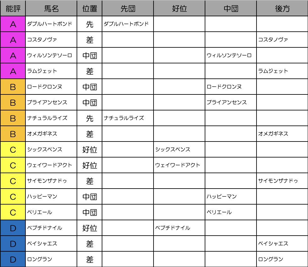 今年は先行タイプの馬があまりいないメンバー構成。ナチュラルライズかダブルハートボンドが逃げる展開になるんじゃないでしょうか。