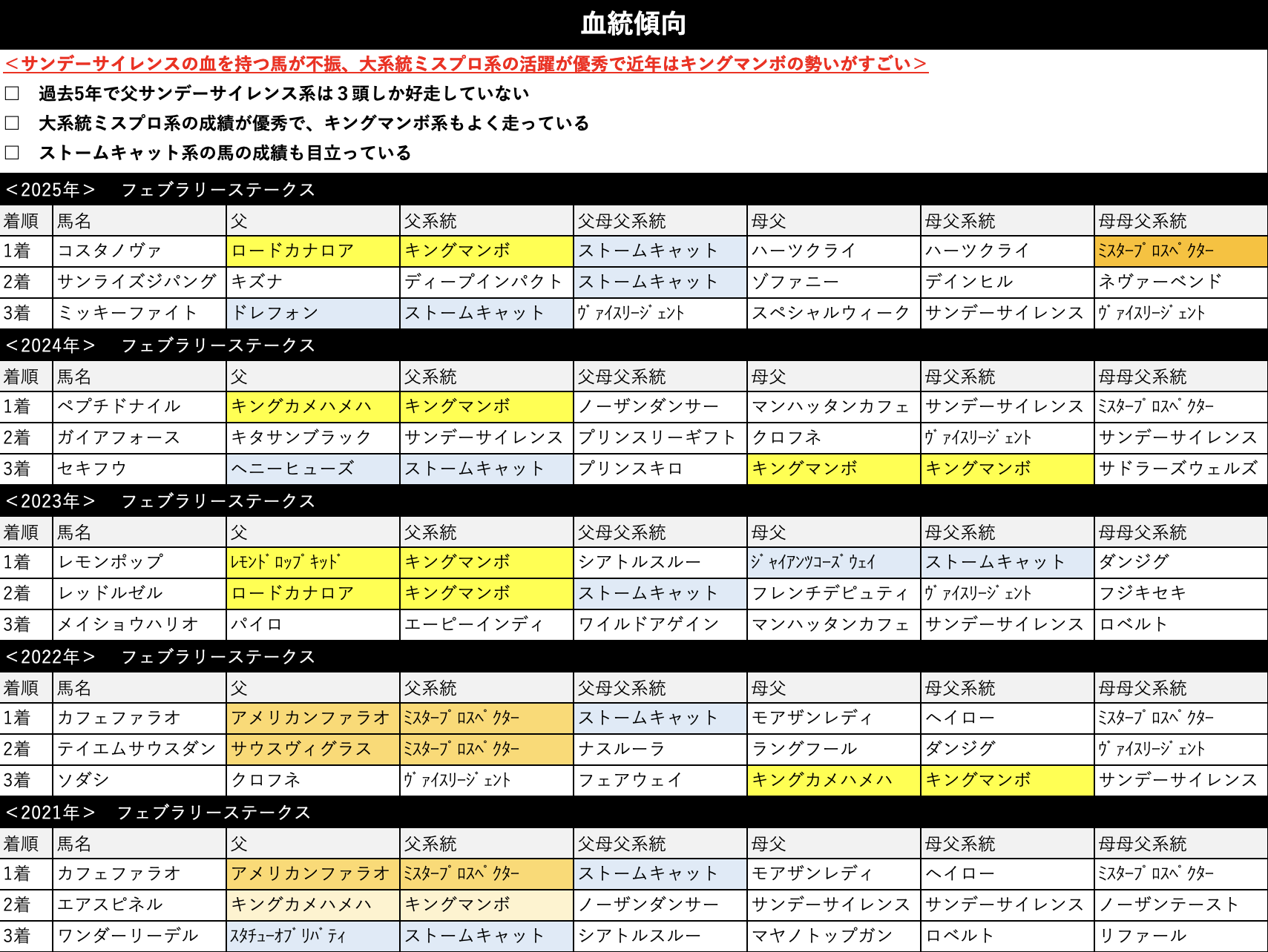 過去5年の血統傾向を見ても父は非サンデーサイレンス系の方が優秀。特に近年はキングマンボの血を持つ馬の活躍がやたらに目立っています。
