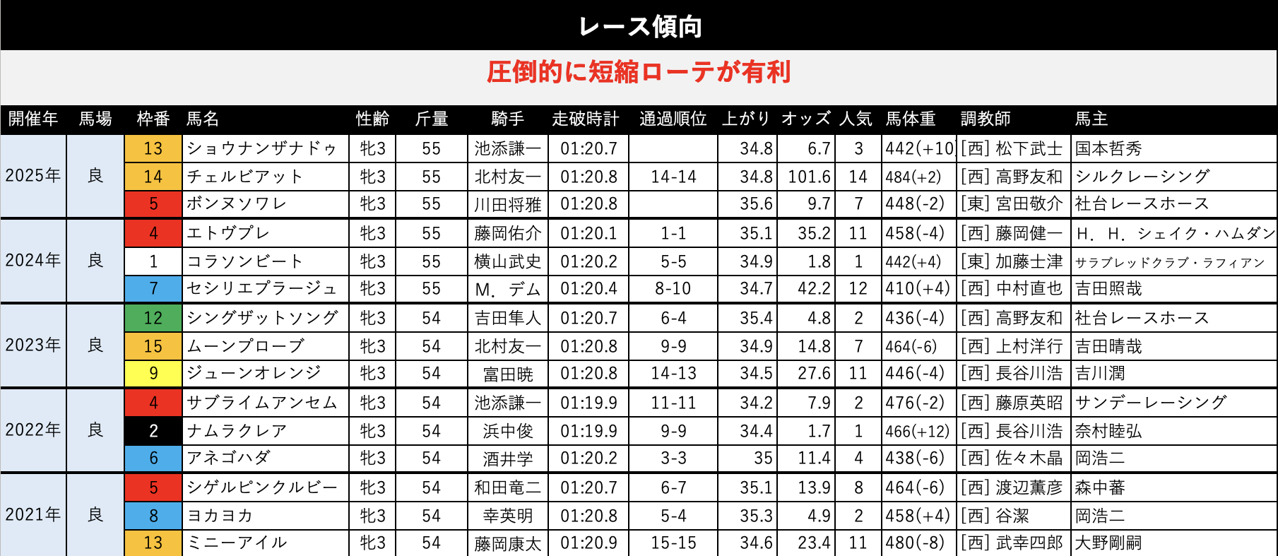 ただ、これで「延長ローテも大丈夫なんだ!」ということで、再度、延長ローテのスピードタイプの馬が多数出走してくるとハイペースになってまた短縮有利なレースになりそう。この見極めが重要になってきそうです。