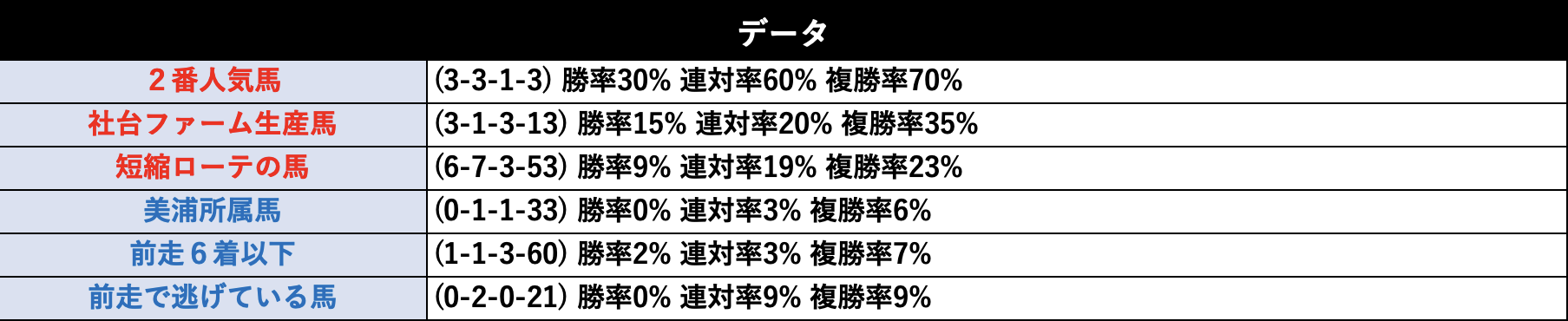 このレースの最大の特徴は距離短縮組が有利で距離延長組が全く来ないこと。以前はこのデータがあまり知られていなかったので、短縮ローテの馬だけを買えば自動的に儲かるレースでしたが、もうほぼ全てのファンに知られている上に陣営側もそれを知っているからか延長ローテでここを使ってくる馬は少なくなりました。