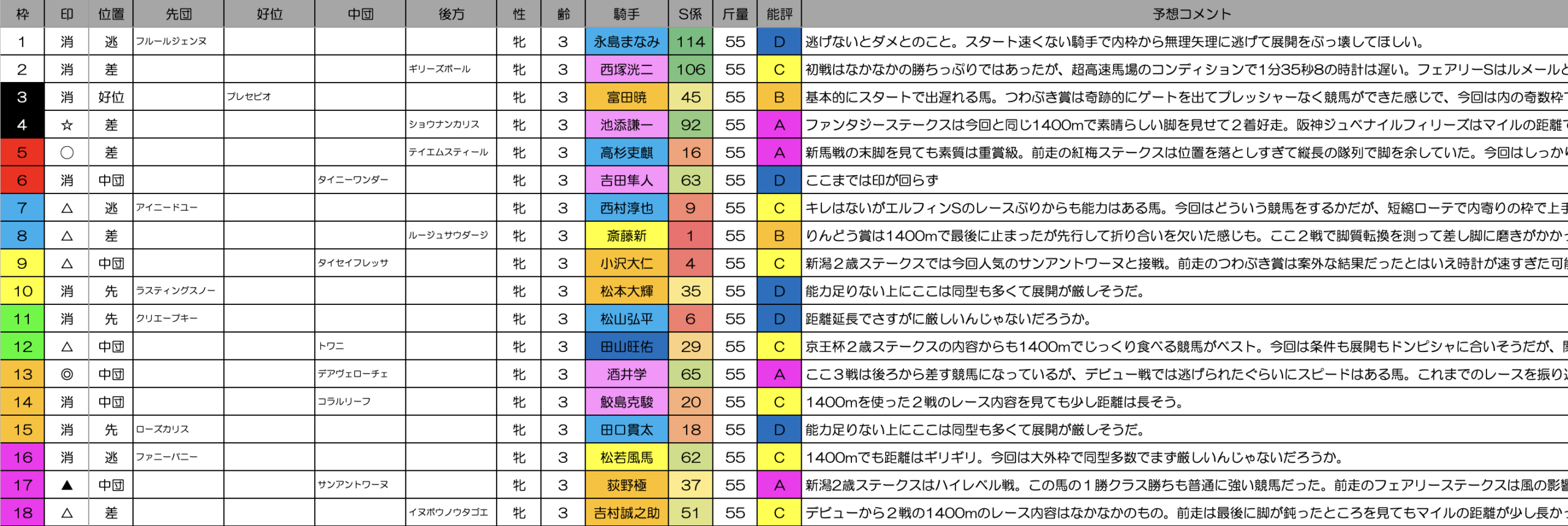 新潟2歳ステークスはハイレベル戦。この馬の1勝クラス勝ちも普通に強い競馬だった。前走のフェアリーステークスは風の影響か前しか来れないレースで脚を余していた印象。やはりマイルの距離は少し長いという印象も受けた。